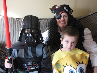 Now, before I finish, I should post a few Halloween pictures too since I didn't even manage to do that! Nathan was Spongebob and Kyle was Darth Vadar or "Dark Vadar" as he calls him sometimes. Everything in our house is currently about Star Wars it seems! We've finally hit the phase I knew was coming! Mum came over for a bit too and she was all dressed as a pirate! Fun!